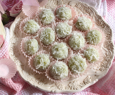 This is a Malay confection made from glutinous rice flour coloured green from the juice of pandan leaves (South East Asia's answer to vanilla). Filled with a sweet burst of a rich, dark, coconut palm sugar syrup, boiled in water until it floats to the surface and then rolled in lightly salted shredded coconut it makes a wonderfully soft, sticky, gooey, stretchy sweet that is utterly delicious. Place them in pretty paper cases instead of piling them up like a stack of cannon balls and they are food fit for a princess, prince, king or queen.