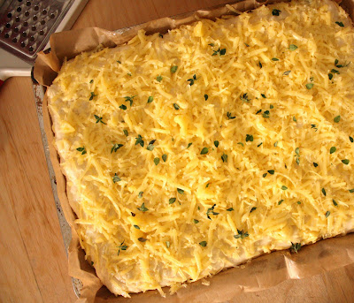 Mix the soft butter and chopped garlic to a paste and spread over the dough. Grate the cheese over the dough and then sprinkle with thyme.